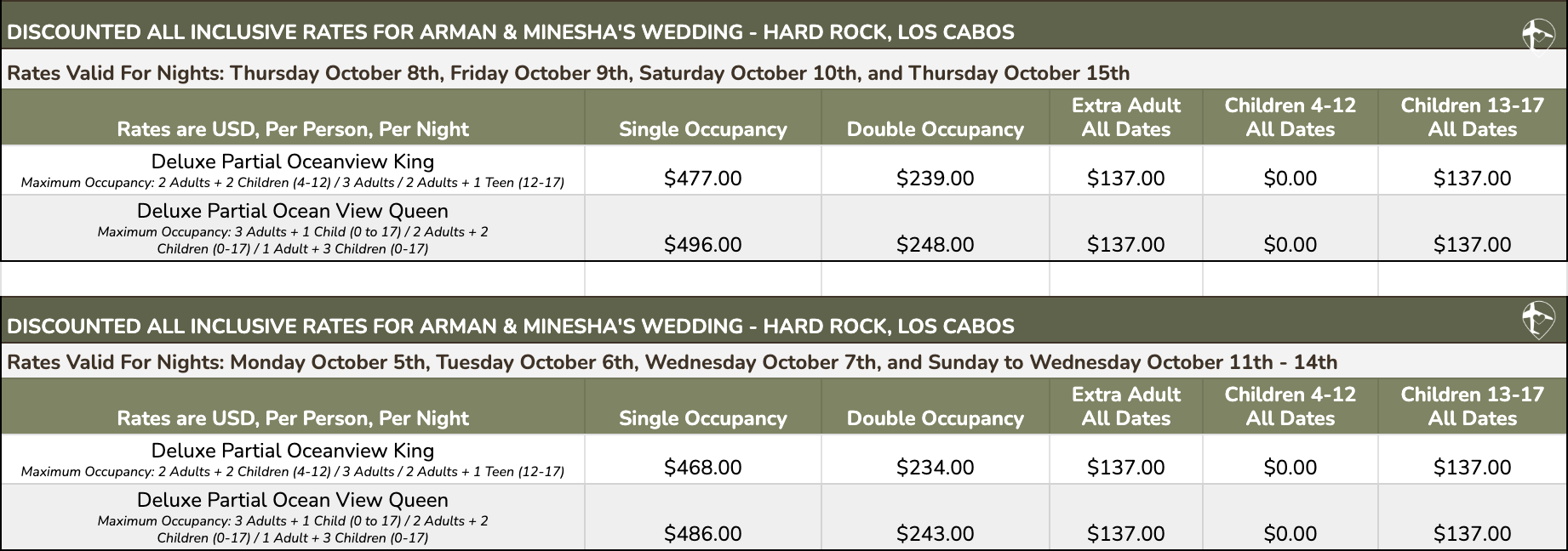 (Vacation Planners will provide pricing for any guests beyond the first two per room.)