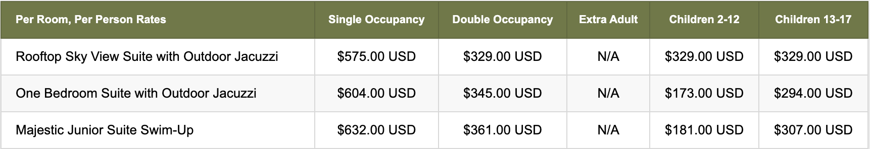 Note: When a child is sharing a room with one adult, the adult double rate applies to both the adult and the child. The child rate only applies when a child is sharing the room with two adults.