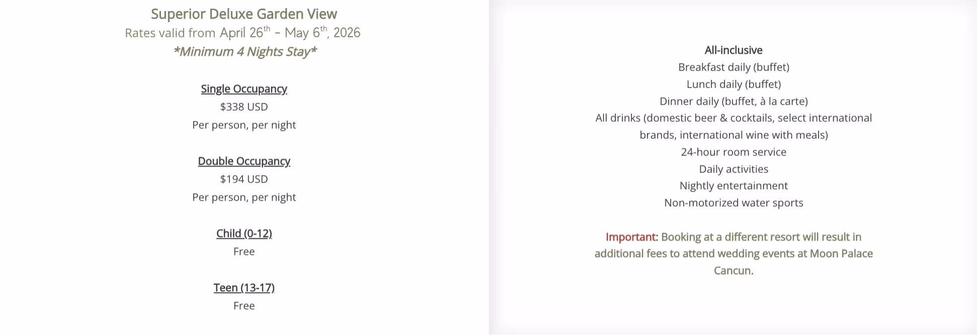 Reservations of 4 or more night, please email: transfercancun@palaceresorts.com