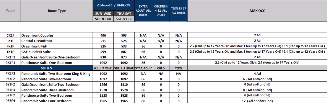 To request an upgrade, please begin by booking a standard room through the “Book Now” button above. Once your reservation is confirmed, email your confirmation number to your dedicated group Account Manager with the upgraded room category you want to request.